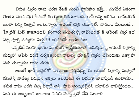 ramcharan, chirutha, orange, naga babu, bhaskar, dharani